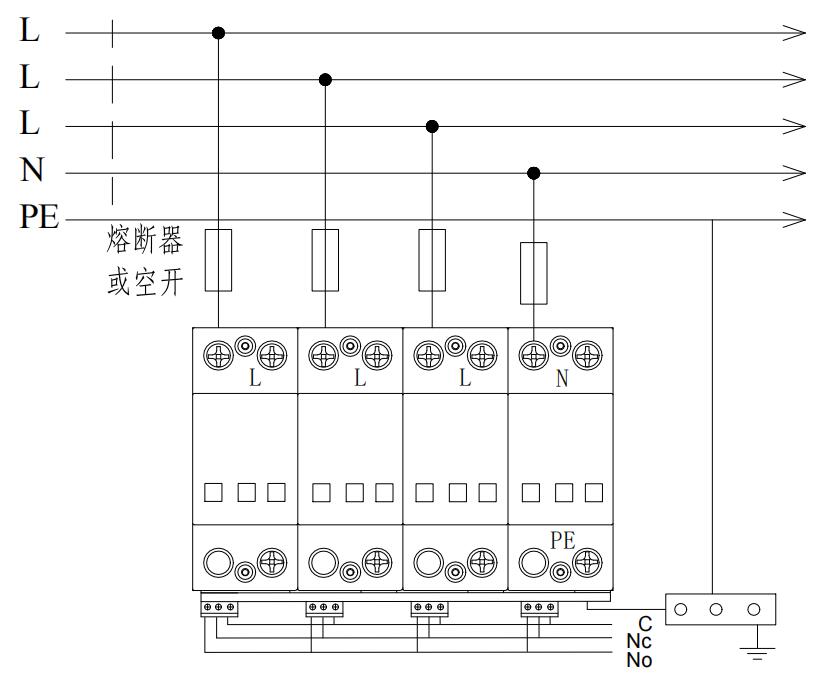 3 模块结构防雷器前端应串联合适的熔断器或空开。